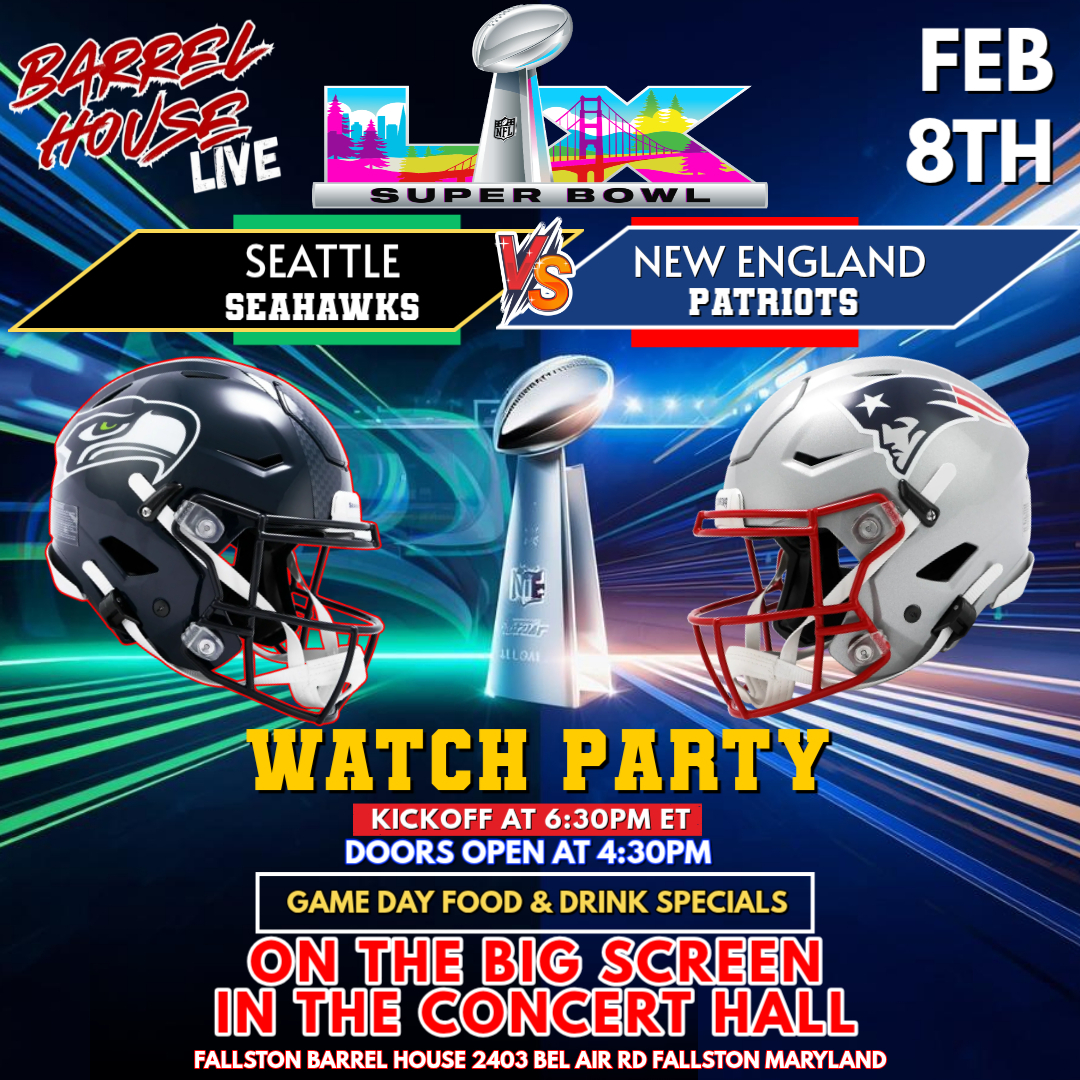 Come watch the Big Game on the Big Screen in the Concert Hall at Barrel House Live! Doors open at 4:30pm Game Day food and drink specials Giveaways and more! Fun for the entire family!